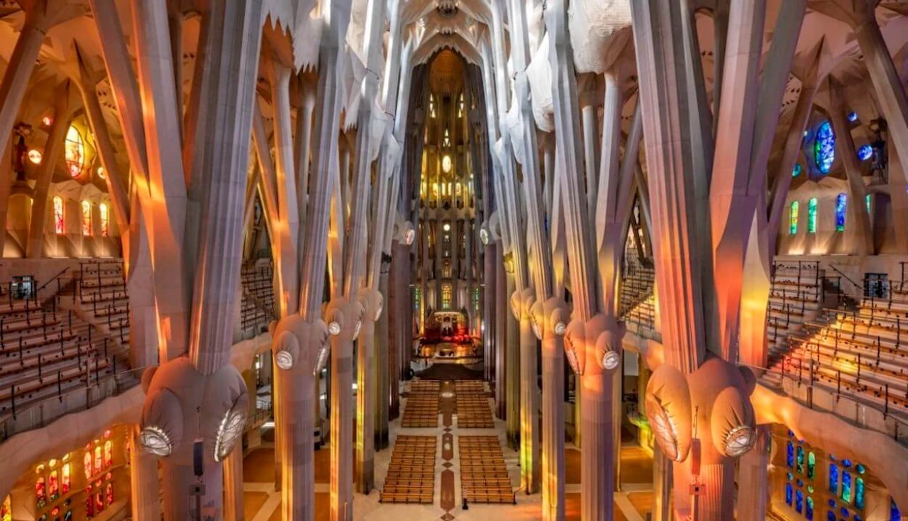 O interior? Prepare-se. Gaudí criou as colunas para se assemelharem aos troncos de árvores que se ramificam no teto, dando a sensação de que você está caminhando por uma floresta mística e colorida.